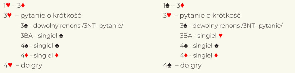 • 3♣ = góra otwarcia, dalsze pytanie to 3, otwierający odpowiada odwrotnie (3 to piki, 3♠ to kiery)